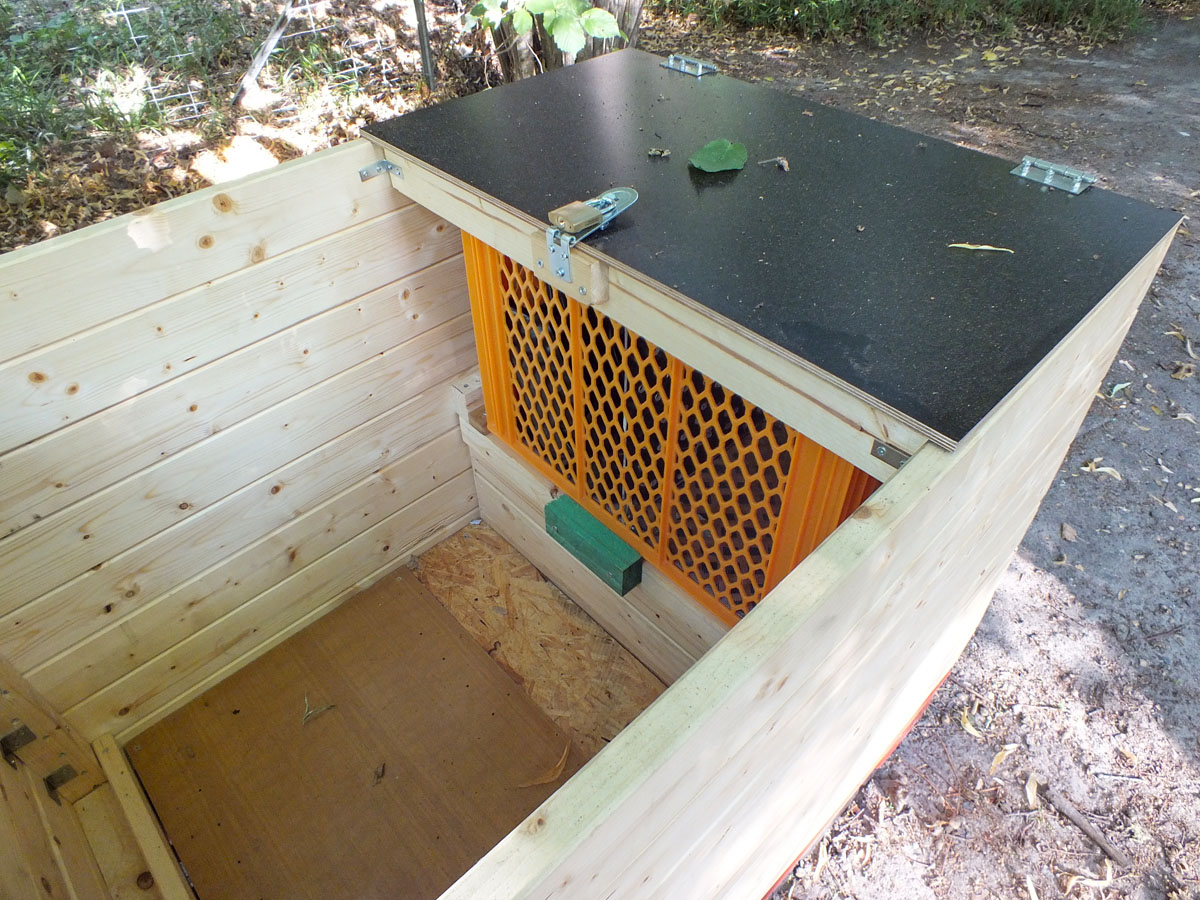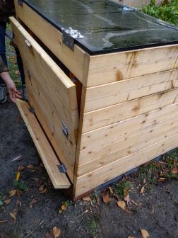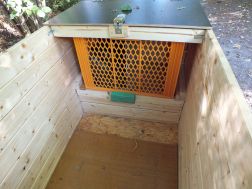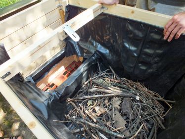 - Den Deckel (lackierte Siebdruckplatte) über der Wurmkiste befestigen, damit die Würmer vor Regenwasser geschützt werden.