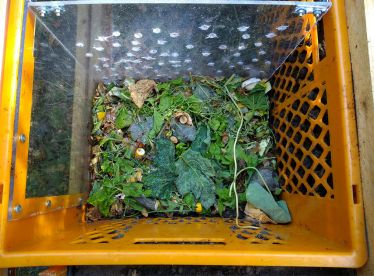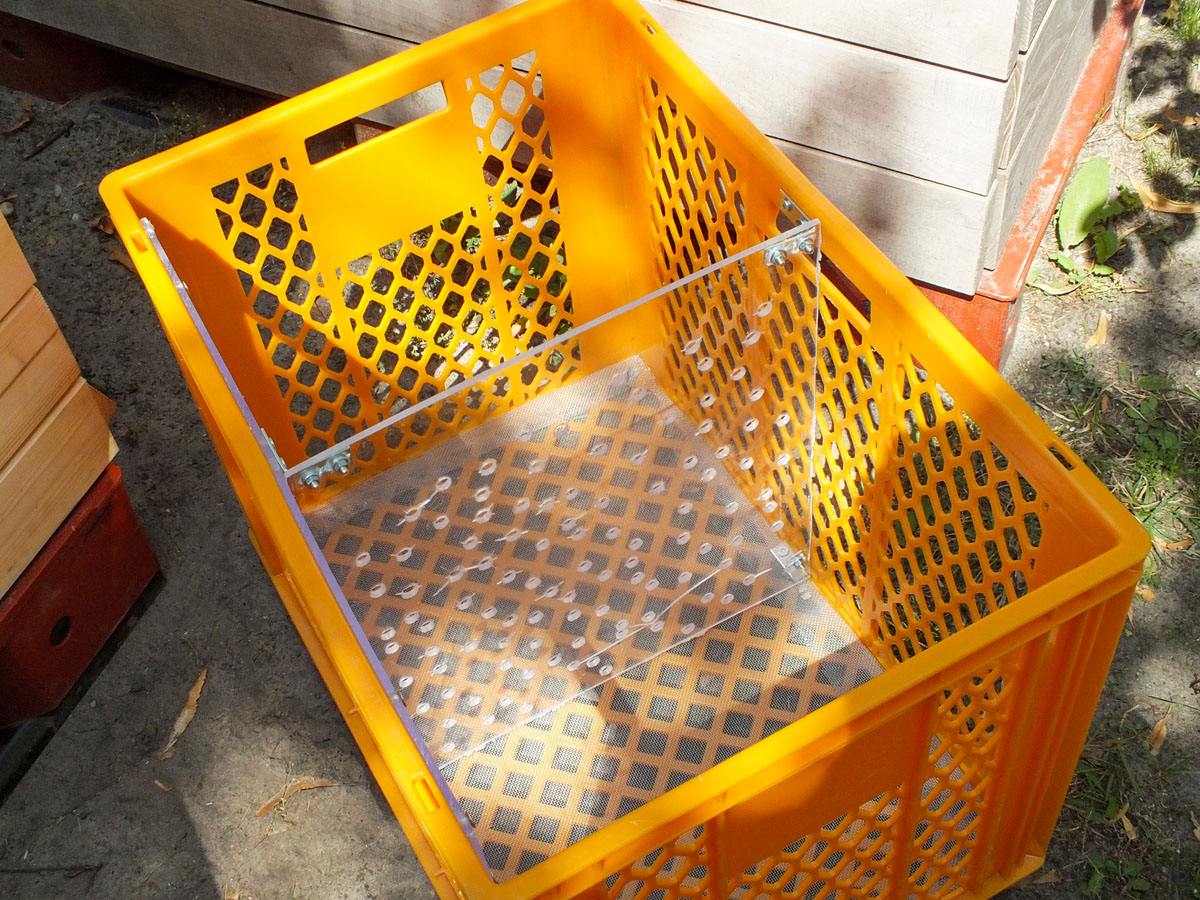 - Anschließend die Wurmkiste mit der kleineren Plexiglasscheibe (mit Löchern) als Querwand mittig unterteilen. Dadurch entsteht ein Zweikammer-System innerhalb der Wurmkiste, das abwechselnd mit Bio-Abfall befüllt werden kann.