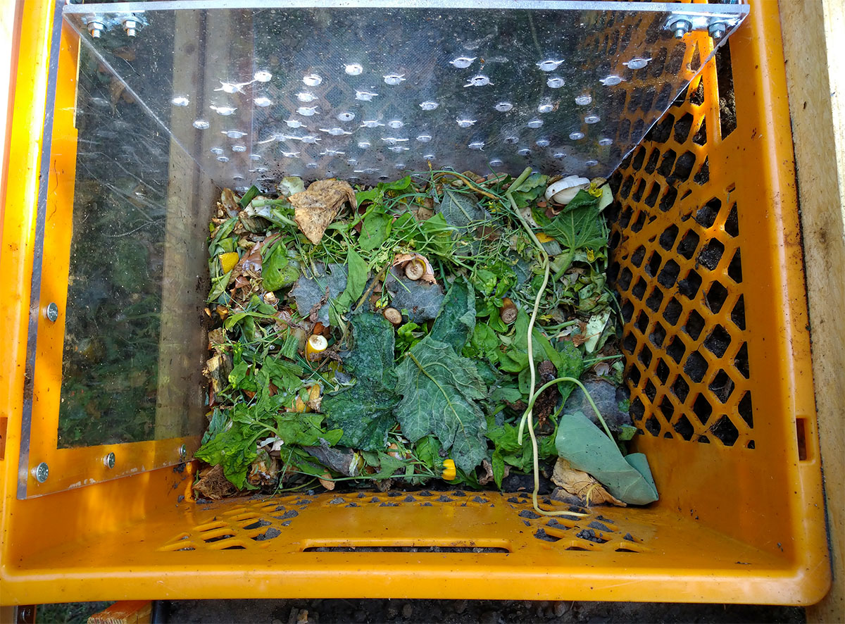- Diese Seite mit der größeren Plexiglasscheibe wieder verschließen (Einblick in die Wurmkiste).