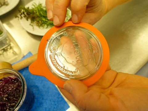 - Bei Zimmertemperatur ca. 5 Tage lang gären lassen. Achtung!: Dabei kann Flüssigkeit austreten, deshalb die Gläser solange in ein Gefäß stellen. Danach sind sie dicht und werden kühl gestellt.