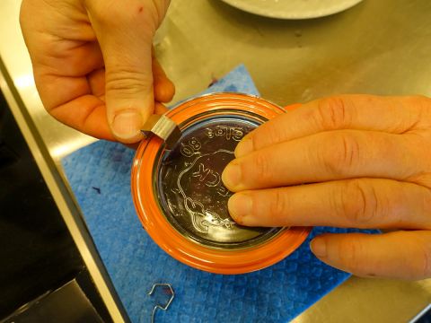 - Die Glasränder säubern, die Gläser mit Gummiring, Glasdeckel und Klammern verschließen.