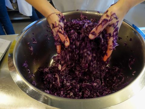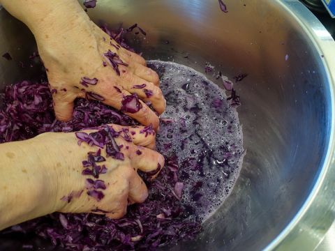 - Unter das frisch gehobelte Kraut etwas geraspelte Möhren mischen.